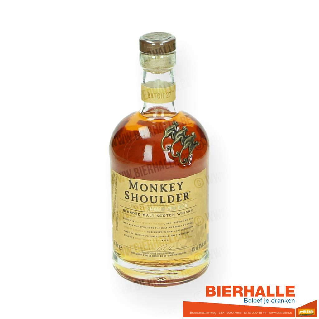 Leeftijd: - Categorie: Blended malt Scotch Turf: - Inhoud: 70 cl Alcohol: 40 % Merk – Producent: Monkey Shoulder Land van herkomst: UK - schotland Aroma: De geur is licht en complex, bevat mooie vanille tonen en heeft zachte en lichte aroma’s van honing en sinaasappelfruit. Smaak: